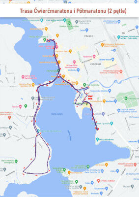 Ćwierćmaraton (10,55 km) – pętla poprowadzona wzdłuż promenady i ulic Ełku (50% asfalt, 25% szuter, 25% kostka).